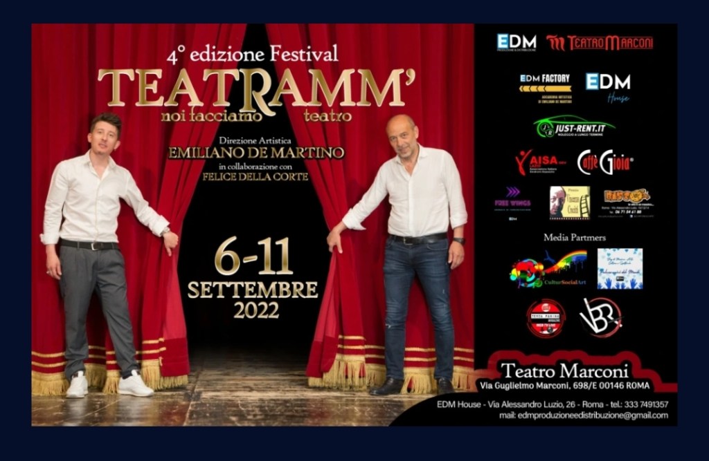 Spettacolo teatraleCortometraggio Romanzo FilmRomanzoShow rock sinfonicoCover BandLibro e cortometraggio Spettacolo TeatraleCortometraggioCortometraggioFestival TeatraleConcerto musicaleRassegna di CortometraggiRassegna di cortometraggiSpettacolo Teatrale